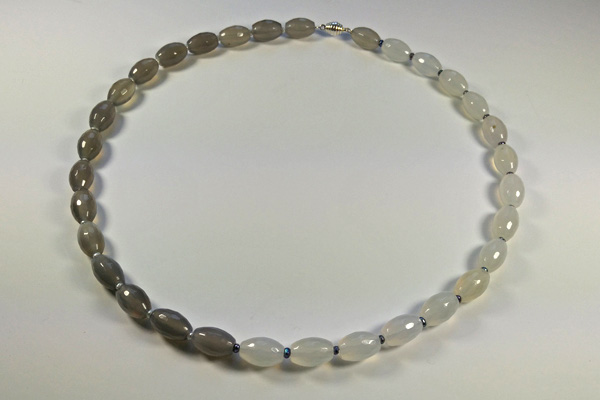 Diese zarte Kette besteht aus facettierten ovalen Achaten und Süßwasserperlen. Die weißen Steine sind durch blau-graue Perlchen getrennt, die grauen durch weiße Perlchen. Mit ovalem Magnetverschluss aus 925 Silber. Achatperlen sind 12 x 8 mm, Kettenlänge 45 cm.