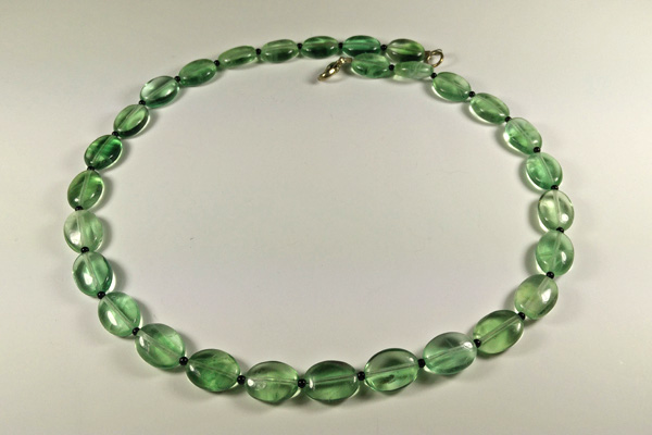 Fluorit-Kette aus durchsichtigen, leuchtendgrünen, ovalen Perlen, getrennt durch kleine Onyx-Kügelchen. Perlen 14 x 10 mm, Kettenlänge 46 cm.