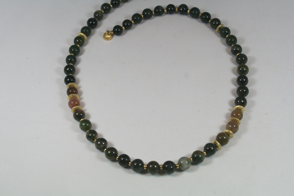 Zierliche Turmalin-Kette in dunkelgrünen, rosa und ocker Tönen. Zwischenteile und Magnetverschluss sind aus polierten oder gebürsteten vergoldetem 925 Silber. Perlen sind ca 7 mm, Kettenlänge 43,5 cm.